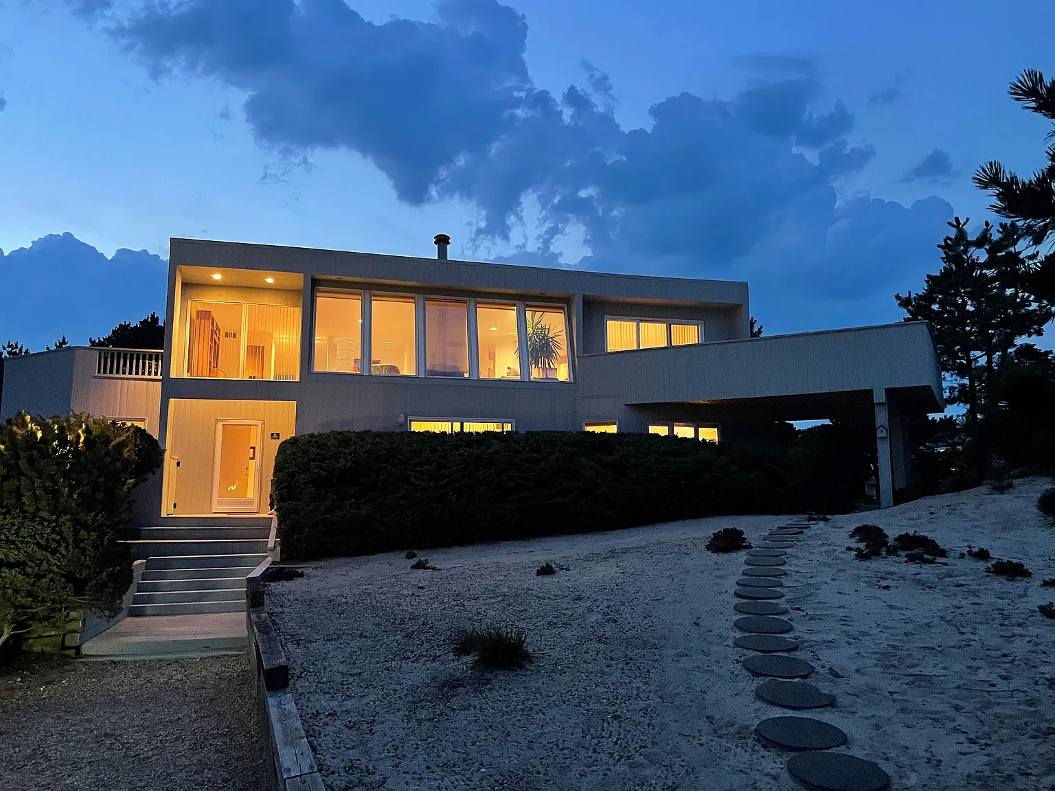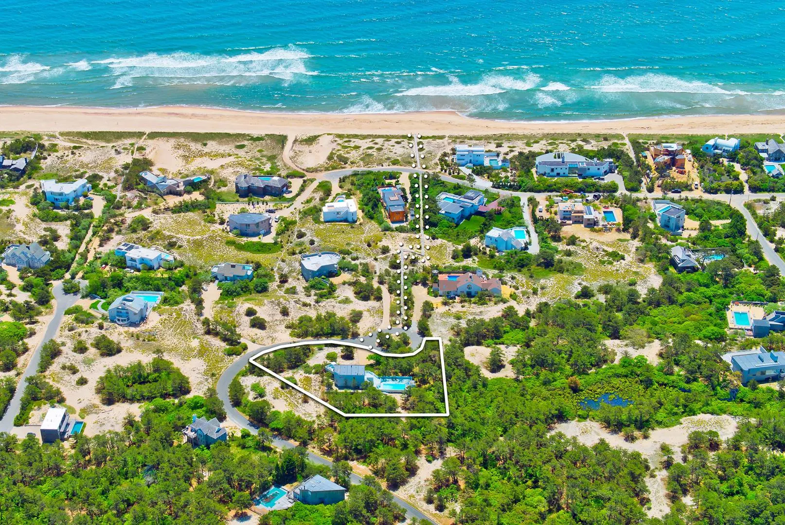 Offered through a bankruptcy sale, 54 Sandcastle Lane presents a rare opportunity to acquire a south-of-the-highway Amagansett Dunes single-family residential property with direct ocean access. The property is currently a 3-bedroom, 2-full-bath, and 1-half-bath contemporary residence, and plans exist for a two-story home with an ocean-view roof deck, swimming pool, and dedicated pool house. Situated on approximately 0.78 acres at the end of a private cul-de-sac and bordered by roughly 28 acres of protected dunes and nature preserve, the site offers exceptional privacy within one of East Hampton’s most coveted beach communities. A deeded oceanfront boardwalk across the driveway provides immediate access to Napeague Ocean Beach, reinforcing the property’s long-term desirability.